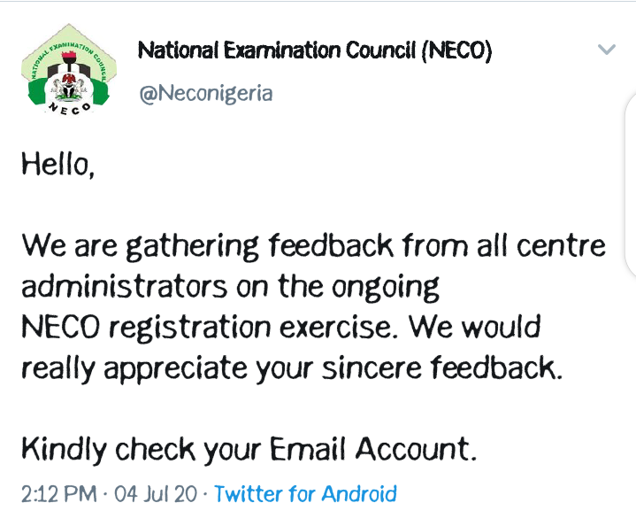 This notice is therefore to all Secondary Schools and likewise all NECO accredited centers nationwide for feedback following messages sent to their emails for the center administrators on the ongoing NECO registration exercise.
